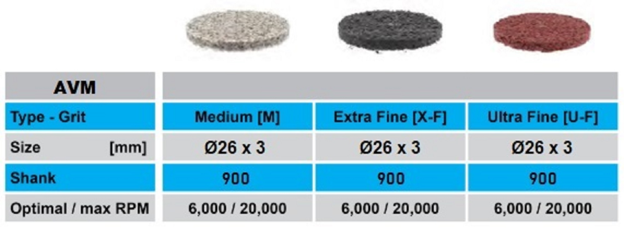 The AVM range is a supple, but highly wear resistant fleece with low heat development. It is ideal for deburring dental trays with fine surfaces. Positional stability is ensured through reinforcing binding. Provides excellent results when grinding 3D-prints.